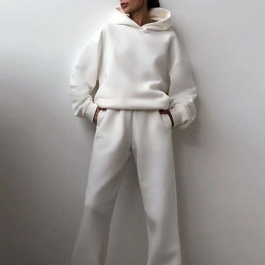 - Women Fleece Two Piece Sets Elegant Solid Color Oversized Warm Hoodies and Long Pant Sports Suit Autumn Winter Tracksuit 2021